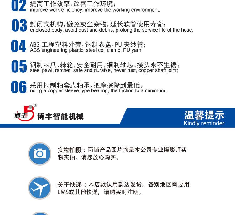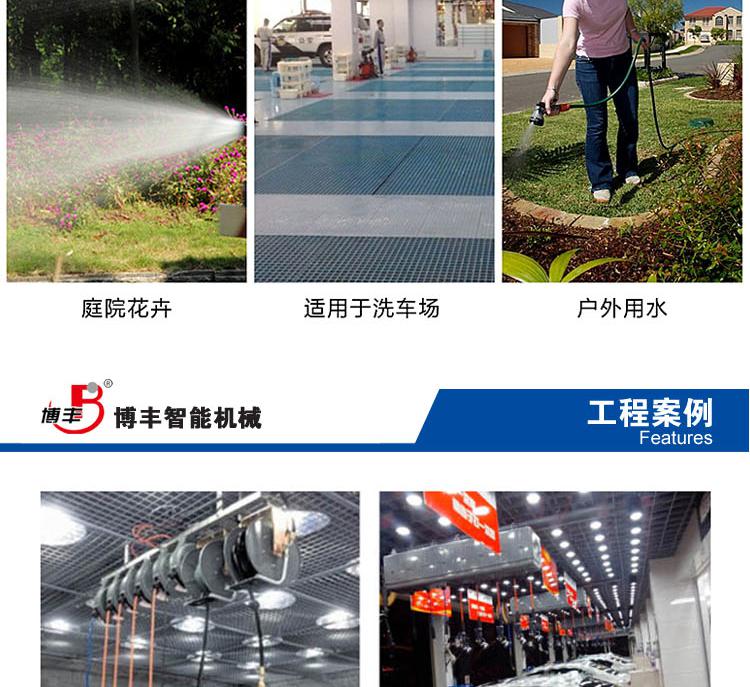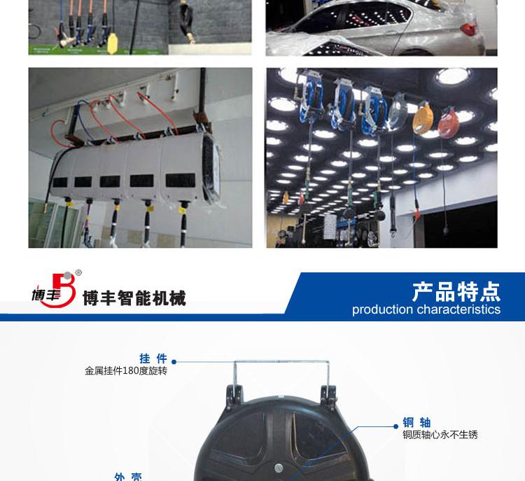 邹平博丰智能机械有限公司专业生产卷线器,卷管器,自动卷管器等产品。主要产品有自动伸缩工作灯系列、自动伸缩排插系列、自动伸缩空气卷轴系列和自动伸缩花园浇灌水管卷轴系列,产品依靠优良的品质及成熟完善的销售网络和服务网点,塑造“博丰”品牌引领国际市场。邹平博丰智能机械有限公司掀起工作车间环境的新革命**工作环境的新时代。在日常生活中,使用移动的电线、气管、水管拉出和收回时既费时又不方便,给工作和生活带来极大的不便,而且影响工具的使用寿命。如今,工作车间电线、气管等杂乱无章的时代过去来,自动卷管器的出现,使工作车间环境更整洁、美观,使用更方便。目前,“博丰”品牌自动卷轴系列产品已成为众多汽车品牌4S点的“指定使用产品”及“园林绿化浇灌”的**工具。 我们秉承**,诚信合作,顾客满意”的方针,坚持务实的作风,不断创新、扎扎实实、努力拼搏,铸造**品牌。