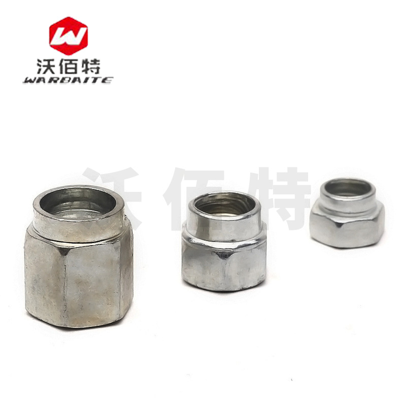图1图2图3可知,铆螺母采用经过化学处理的低碳钢园盘切成所需的毛坯料,把毛坯料放至凹模内,利用上、下凸模进行整形,得到整形的毛坯,然后把经整形的毛坯放在凹模中,利用凸模冲头冷镦出所需的帽沿坯(1)及变形裙部(2),而后再在凹模内利用凸模冲头继续冷镦出帽沿坯(1)和变形裙部(2)。然后将半成品的料放入凹模内利用凸模冲头继续挤压螺母攻丝裙部的螺纹丝孔(3),后利用将半成品坯料放入凹模内利用上冲及下套管进行落料。帽沿的下方有鱼牙齿(6);螺纹丝孔下端的外侧具有导角(5);螺纹丝孔的内壁的螺纹的断面呈等腰梯形,梯形的上底为凹弧形(9),这样使铆接物体与铆螺母紧固连接。