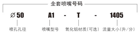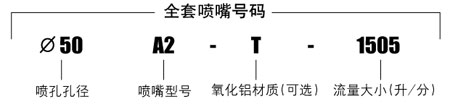 规格型号为 6.4-50mm的喷嘴均用氧化铝陶瓷、316不锈钢铸件、聚丙烯、聚四氟乙烯制造。氧化铝陶瓷和316不锈钢喷嘴为六角形的。聚丙烯、聚四氟乙烯喷嘴为平台形或圆形的。规格型号为 65-92mm的喷嘴无论是用聚丙烯还是聚四氟乙烯都只有圆形的。这些喷嘴也可用其它各种材料制成,应用于特殊领域。