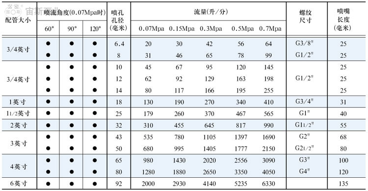 A1型喷嘴产生实心锥形喷雾形状,喷流角度为60-120°。这种紧凑的喷嘴可使液体在给定尺寸的管道上达到**大流量,畅通的通道设计**地减少了阻塞现象。这种喷嘴可在绝大多数管道系统上安装或更新。在0.3Mpa压强下,流率从42至4140升/分。