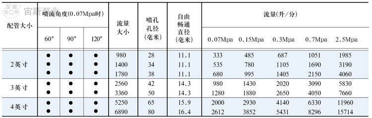 这些较大流量的喷嘴可使液体在给定尺寸的管道上有效地实现**大流量,畅通的通道设计可防止发生阻塞现象。在0.07Mpa压强下,流率为333至2612升/分。这些实心锥形喷雾喷嘴的配管尺寸有2英寸、3英寸、4英寸三种尺寸,喷流角度为60-120°。