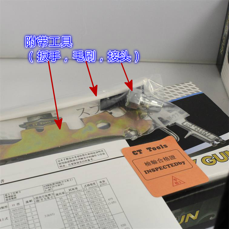 9.全套配置有:喷枪一把,壶一只,说明书,专用扳手一把,刷子一只,合格证,皮管接头一只,六角螺帽一只