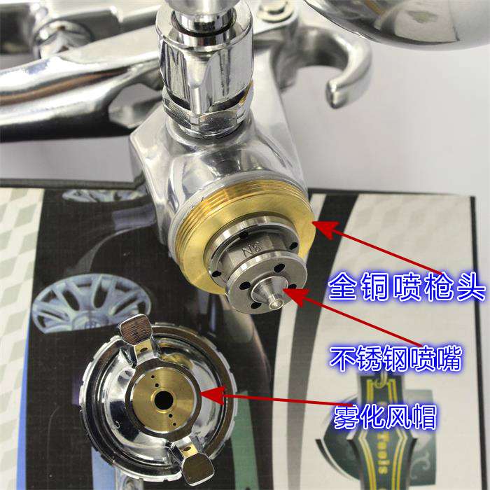1.高端喷枪的雾化气流结构,保证油漆喷出细腻均匀,不产生涡流油漆堵塞风帽,下壶喷枪原理:是利用高速气流而令喷枪局部真空,因而产生吸力把油漆从壶里面吸到喷嘴加以雾化喷出,主要作大面积喷涂,好处是油漆的雾化较好,可以达到漆膜的厚度及光泽度要求。下壶的油漆壶位于喷枪的下部,喷嘴较风帽的中心孔稍向前突出,压缩空气从空气帽的中心孔,喷嘴的周围喷出,在喷嘴的前端行成负压,下壶的喷枪受涂料的粘度影响较为明显,与喷嘴的口径有密切关系。