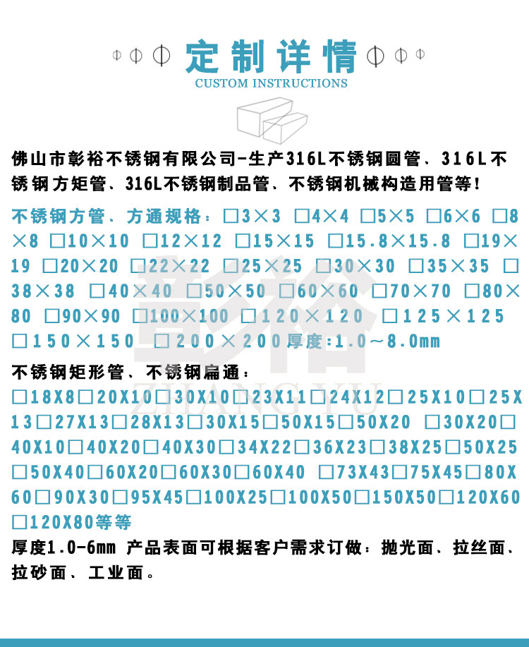 不锈钢长方管10X40、10X50、10X60、10X70、10X80、10X90、10X100、12.7X25.4、15X25、15X30、15X40、15X50、15X60、15X70、15X80、15X90、15X100、20X30、20X40、20X50、20X60、20X70、20X80、20X90、20X100、25X40、25X50、25X60、25X70、25X80、25X90、25X100、25.4X38.1、30X40、30X50、30X60、30X70、30X80、30X90、40X50、40X60、40X70、40X80、45X60、45X75、45X95、50X60、50X75、50X100、50X125、50X150、50X200、50.8X76.2、60X80、60X100、60X120、60X140、60X150、60X200、70X100、70X110、70X130、70X150、70X180、75X100、75X125、75X150、75X175、80X100、80X120、80X140、80X160、90X110、90X130、90X150、100X120、100X140、100X150、100X200、110X130、110X150、120X140 、120X180、125X175、130X170二、厚度:1.5、2.0、2.5 、3.0、4.0、5.0、6.0、8.0、10.0