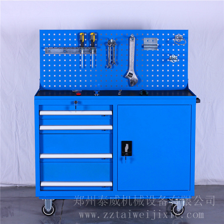 3、结构:上部一块方孔挂板;下部左侧四个抽屉带一键锁止防滑功能,下部右侧单开门内部一块可调层板;