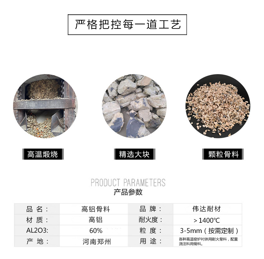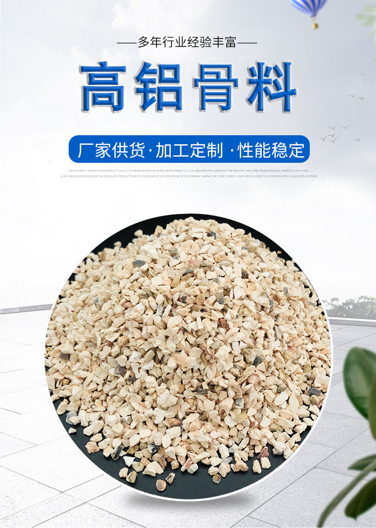 骨料的大小及含量均可按客户要求定制! 高铝骨料是制作耐火砖、浇注料、特种陶瓷、铸造涂料、矾土水泥、铸造辅料、工业氧化铝及其它不定型耐火材料的主要原料。适用于耐火材料、钢铁冶炼、工业炼铝、精密铸造、水处理、特种陶瓷、涂料等行业。(1)可与高铝水泥、高铝细粉、水按比例混合后生成强度非常 高的耐火浇注料;