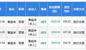 据深交所官网,2023年1月6日,坚朗五金(SZ 002791,收盘价:107.13元)高管黄庭来通过竞价交易,减持公司6000股,成交均价109.92元/股,减持65.95万元。