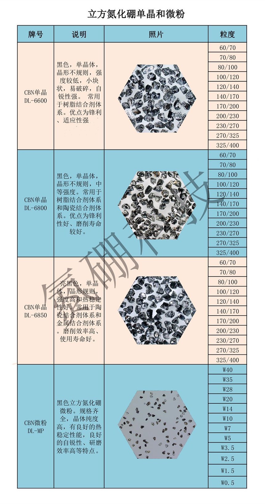 特点:立方氮化硼(CBN)是硬度仅次于金刚石的超硬材料。它不但具有金刚石的许多优良特性,而且有更高的热稳定性和对铁族金属及其合金的化学惰性。它作为工程材料,已经广泛应用于黑色金属及其合金材料加工工业。同时,它又以其优异的热学、电学、光学和声学等性能,在一系列高科技领域得到应用,成为一种具有发展前景的功能材料。