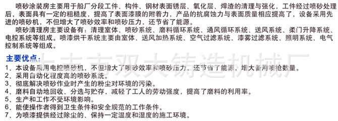 | 江苏省大丰市双大铸造机械厂是一家集科研、设计、制造安装调试与咨询服务于一体的铸造机械专业生产企业,主产品有:Q31、Q32、Q35、Q36、Q37、Q69等系列抛丸清理设备及大型履带式预处理设备;S11系列混砂机及各种型号的混砂配件;同时配套生产特种合金耐磨铸铁、铸钢件、热处理设备、耐热钢件以及各种材质型号的钢丸。本厂可向客户提供整机整线的成套设备,也可根据客户的特殊要求进行设计。产品销售全国20多个省市。本厂地处黄海之滨的江苏省大丰市,级自然保护区麋鹿的故乡,这里人文荟萃,民风淳朴,是历史名人《水浒传》作者施耐庵的故乡,是新四军,八路军会师地。这里交通便捷,204国道,沿海高速,新长铁路穿市而过。优越的环境造**了天时、地利、人和的双大铸造机械厂。 |