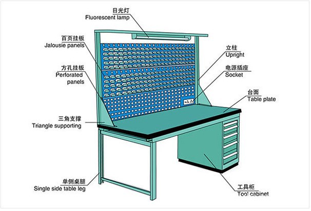 3、根据用户要求,工作台桌面可选择:高分子复合桌面、防火板桌面、不锈钢包面、铁板合成面、榉木桌面、橡木层压板左面、防静电桌面、电木板贴面等 。