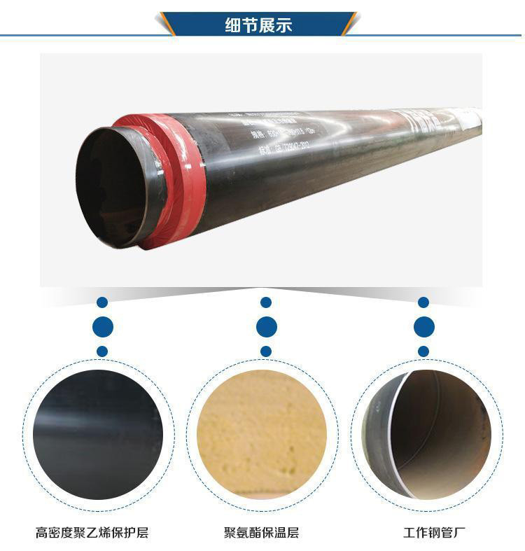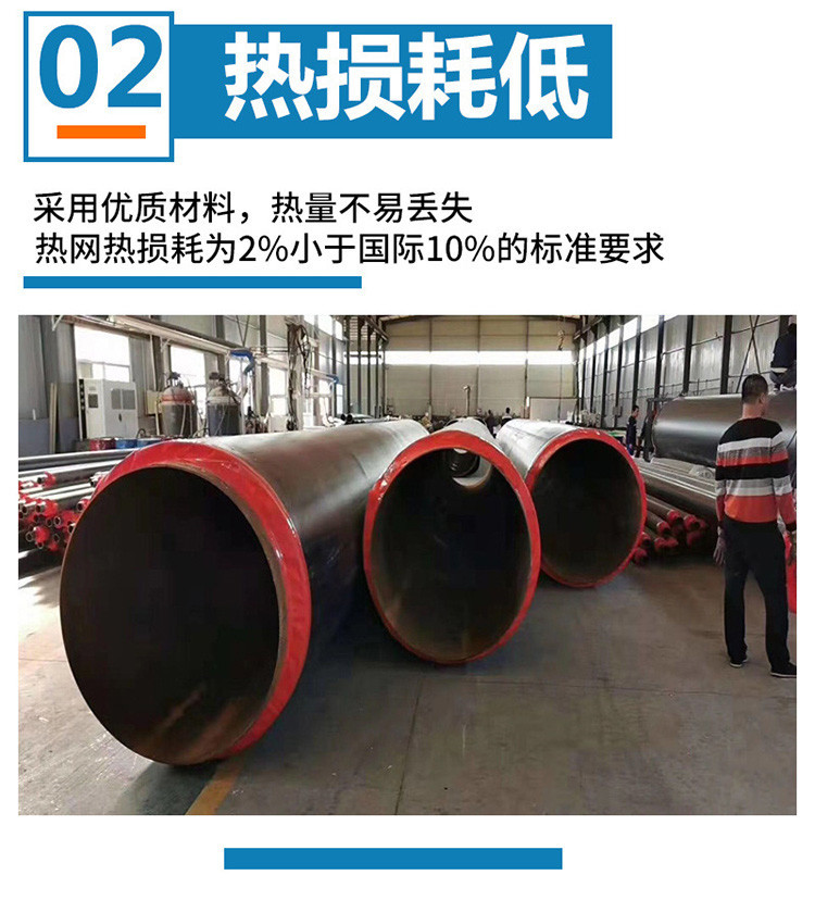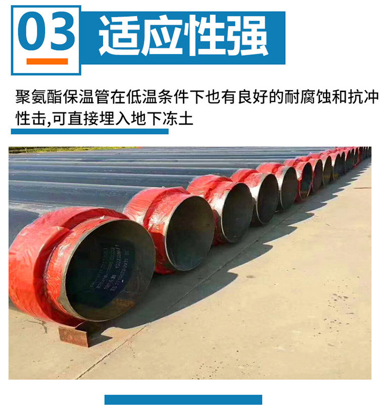 硬质聚氨酯喷涂聚乙烯缠绕预制直埋保温管保温性能好,热损失仅为传统管材的25%,长期运行可节约大量能源,显著降低能源成本。 聚氨酯保温管具有很强的防水和耐腐蚀能力,不需附设管沟,可直接埋入地下或水中,施工简便迅速,综合造价低。聚氨酯保温管使用寿命可达30-50年,正确的安装和使用可使管网维修费用极低。 聚氨酯保温管可设置报警系统,自动检测管网渗漏故障,准确指示故障位置并自动报警。