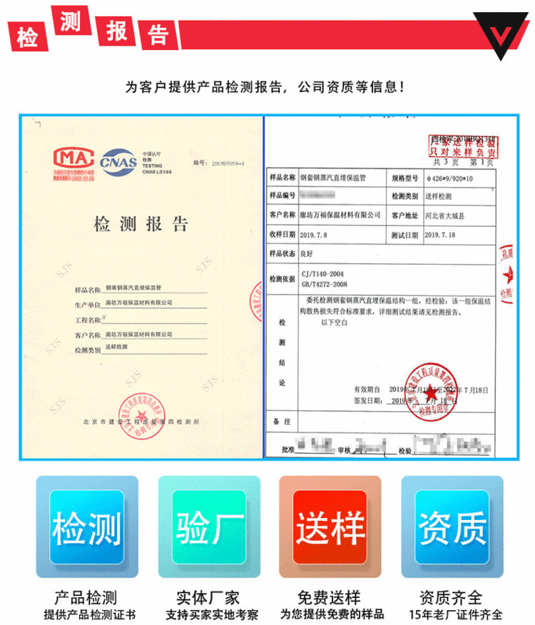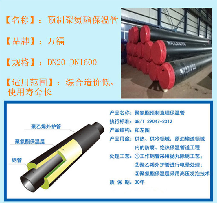 廊坊万福保温材料有限公司专业生产加工:聚氨酯发泡保温管、供暖地埋管,热力管道 蒸汽保温管 直埋预制保温管、钢套钢蒸汽保温管、无缝保温钢管等产品。拥有完整、科学的质量管理体系。