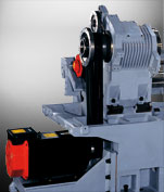 以专用高性能 V 型皮带传动主轴系统,可让维修更为容易,而且降低马达产生热量对主轴精度的影响。经由精密调校之皮带轮减速比,让马达最大转速与主轴最大转速同时达到,从而降低全马力输出之最低转速并提高扭矩,使马达充份发挥潜能而达到最大车削能力。
