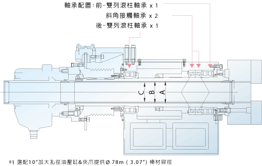 *4 选用 10" 大孔径油压缸及夹头时,棒材容径可达 Ø 78 mm