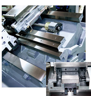 超大尺寸的硬轨与底座、床鞍一体铸造成型,经热处理且精密研磨,并以大跨距设计达成最大的强度与精度。硬轨设计也提供了重切削与断续车削应用的刚性需求。