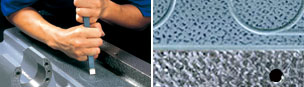 手工铲花 所有滑板,机头,刀塔,尾座,及滚珠导螺杆结构与基座接触面皆以手工铲花,以达成最大组装精度、结构刚性及均衡负载。