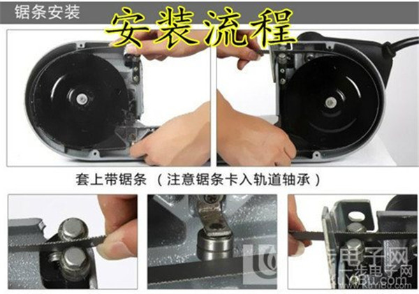 9、顺时针转动手柄以便释放锯片导杆上的张力。然后释放侧面板的锁以便打开侧面板。然后从驱动轮上取下锯片并将其从锯带导杆上松开。