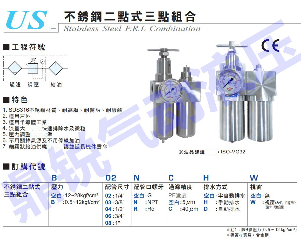 气压传动系统中,气源处理件是指空气过滤器、减压阀和油雾器,有些电磁阀和气缸能够实现无油润滑(靠润滑脂实现润滑功能),便不需要使用油雾器!过滤度一般为50-75μm,调压范围为0.5-1.0Mpa,如需过滤精度为5-10μm,10-20μm,25-40μm,及调压为0.05-0.3Mpa,0.05-1.0Mpa三大件无管连接而成的组件称为三联件。三大件是多数气动系统中不可缺少的气源装置,安装在用气设备近处,是压缩空气过滤水分工具。三大件的安装顺序依进气方向分别为空气过滤器、减压阀和油雾器。空气过滤器和减压阀组合在一起可以称为气动二联件。还可以将空气过滤器和减压阀集装在一起,便成为过滤减压阀(功能与空气过滤器和减压阀结合起来使用一样)。有些场合不能允许压缩空气中存在油雾,则需要使用油雾分离器将压缩空气中的油雾过滤掉。这几个元件可以根据需要进行选择,并可以将他们组合起来使用。