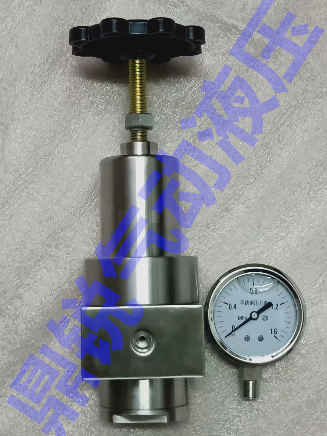 2、压力调节时,在转动旋钮前请先拉起再旋转,压下旋转钮为定位。旋转钮向右为调高出口压力,向左旋转为调低出口压力。调节压力时应逐步均匀地调至所需压力值,不应一步调节到位。