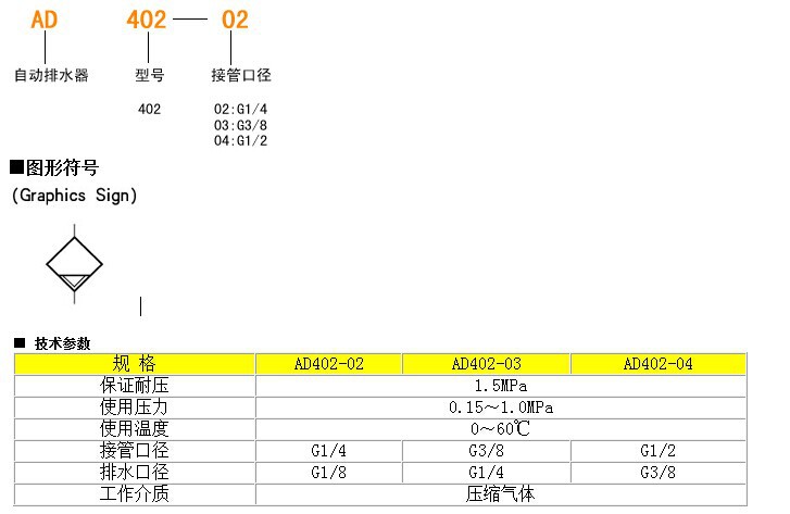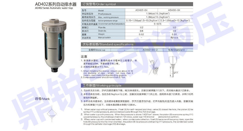 本产品安装在自动排水器,空气过滤器,空气过滤减压阀的水杯底部,能自动排放积聚在水杯中的冷凝水。