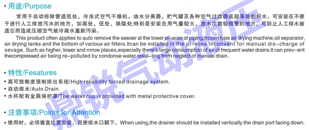 常用于自动排除管道,冷冻式空气干燥机,油水分离器,贮气罐及各种空气过滤器底部等处的积水。可安装在不便于进行人工排放污水,用气量较大,放水次数频繁的地方。