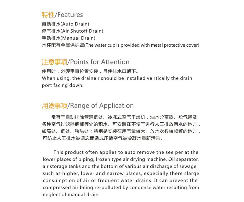 本产品安装在自动排水器,空气过滤器,空气过滤减压阀的水杯底部,能自动排放积聚在水杯中的冷凝水。