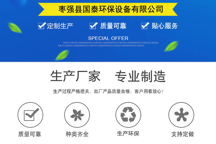 枣强县国泰环保设备有限公司是一家集玻璃钢制品、环保设备企业,我公司拥有完整、科学的质量管理体系。本公司经营玻璃钢脱硫塔、玻璃钢格栅、玻璃钢化粪池、塑料拼接格栅、脱硫除尘设备等系列产品。公司以先进的生产工艺、严格的质量管理来专业生产玻璃钢系列产品。 枣强县国泰环保设备有限公司以“艰苦奋斗、争创品质”为企业精神,“以顾客为中心,依靠高科技创新、推出高效、节能、环保**,奉献社会”为企业理念,让用户满意。