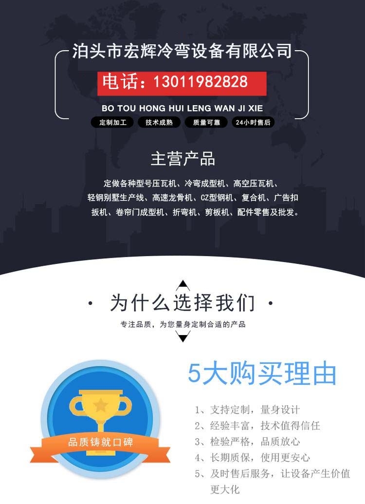 泊头市宏辉冷弯设备有限公司位于有“铸造之乡”、“汽车模具之乡”的河北省泊头市。北依京津,东临渤海,南接齐鲁,距北京250公里,距塘沽港180公里,距黄骅港80公里。位于京津冀经济圈内,环渤海经济带中。有京沪铁路、104、106国道、有京沪、石黄两条高速公路。我公司多年来一直从事钢结构用屋面板及墙面板彩钢瓦设备生产。拥有先进的生产设备和良好的开发设计***,设备以率、高精度、模具耐磨损等优点居同行业良好地位。其产品从初的屋面板、墙面板彩钢瓦设备至今已研发出几十种系列的彩钢瓦设备生产线,完全能满足各大客户的需求。我公司专业生产轻钢龙骨设备,轻钢别墅设备,集成吊顶设备,金属三维扣设备,我们的产品系列有:夹芯复合板生产线、c/z型钢机、琉璃瓦成型机、屋顶板成型机、墙面板成型机、双层成型机、角驰成型机、防风抑尘网成型机、高速护栏成型机、楼承板成型机、几字钢成型机、w型钢带成型机、车厢板成型机、屋脊瓦成型机、广告装饰扣板成型机、卷帘门成型机、底板成型机、折弯剪板分条成型机、雨搭屋檐板成型机、起拱成型机、配套辅助设备。