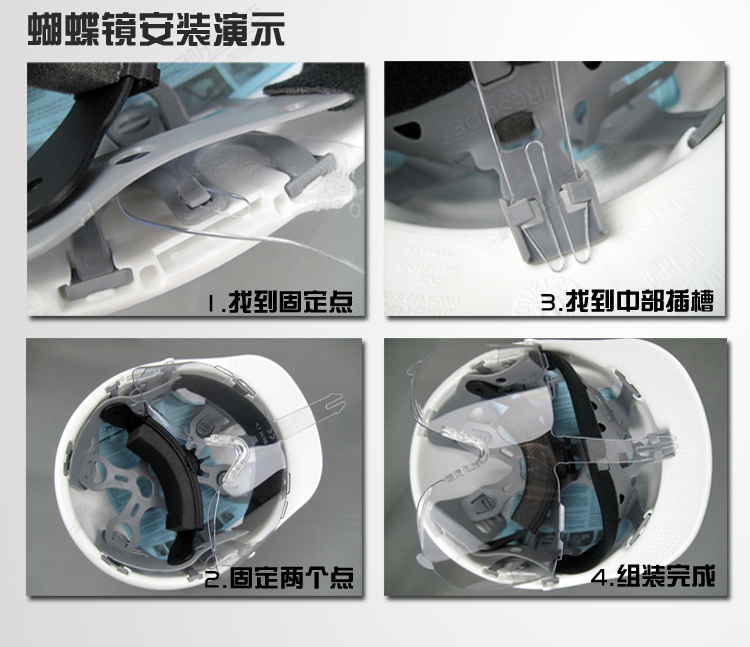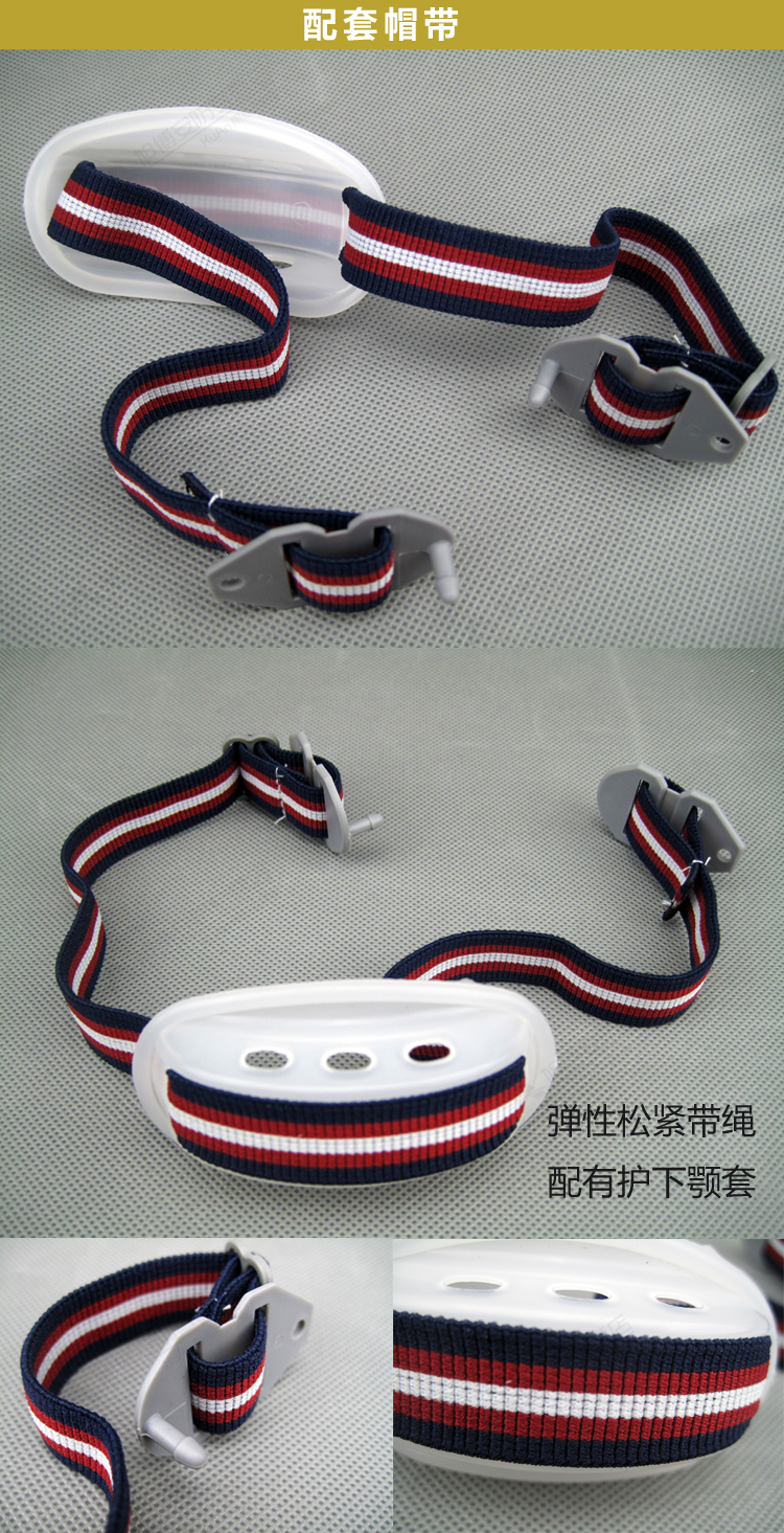 八点支撑戴具,调整轮式设计 配黑色天鹅绒防汗带 符合EN-397、GB2811-2007标准 【产品标志】 EN397:1995 工业安全头盔的欧洲标准编号及出版年份 53-63CM 头盔的尺寸范围,头部周长 -10℃/50℃ 头盔应在以下温度货以下温度的范围内都能提供一些保护。 440Vac 头盔能保护使用者抵抗短暂的440Vac以下的电压。 LD 能抵抗一些横向压力的负荷