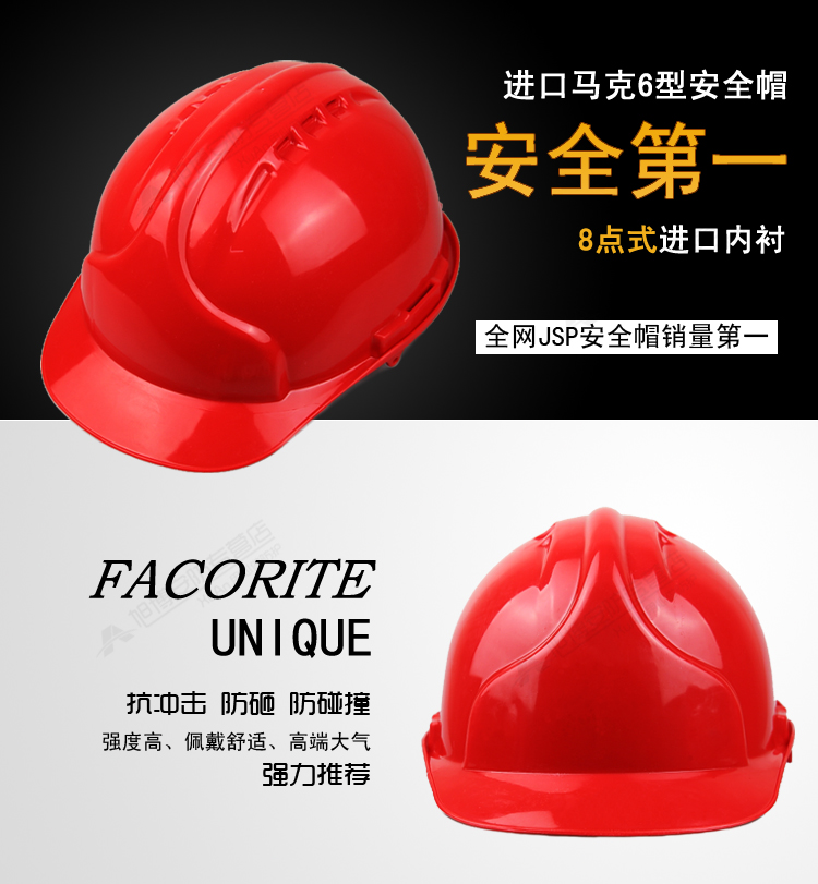 【详细介绍】 1、头盔由外壳和戴具组成。 2、生产日期注于头盔帽檐上。 3、应每日检查头盔外壳及戴具的明显损伤。 4、头盔的使用寿命受多种因素影响,如冷、热,化学物质及误用。 5、头盔在没有缺陷的情况之下能实现其所有功能。正常情况下,头盔能提 供2-3年的充分保护。 【工业安全头盔安装及调节】 头盔佩戴时须根据使用者头部尺寸进行调节。头盔帽檐须朝前面。改变佩戴时,调节头盔后面的带具并确保头顶佩戴舒适。在未被使用或被运输期间,防护面罩应被储存在箱子中,以避免日光直接照射,远离化学物质及粗糙物质,并且不可被应无所损坏。 【使用】 头盔是吸收外壳及戴具间所受到打击物撞击的压力而遭受破坏的,及时损坏不明显,任何受到重压的头盔都应该更换。 【注意事项】 JSP公司的安全头盔不论何种型号,能相互调换固定带,护耳器,面罩及灯具。未经制造商许可,不得擅自在头盔上油漆及粘贴。 不得使用任何非JSP公司建议使用的组成部件。头盔应用温热肥皂谁清洗并用干布擦干。头盔不应用粗糙物及化学溶液清洗,且应避免阳光直射及接触任何化学溶液。 【追加说明】 马克六型安全帽:高密度聚乙烯帽壳,可防紫外线。低密度聚乙烯内衬,八点式支撑戴具。具有电绝缘性能,并配有防汗带,安全舒适。滑扣式头带,设有铅笔座,方便实用。调整轮式头带,单手便可调节,锁定式滑轮,确保戴具不滑动。帽壳背部设有名片座,具有存储物品的作用。帽沿背面左右两边各有防滑点,在潮湿与油污环境或戴手套时也能轻易举起。有带气孔型与不带气孔型可供选择。符合EN-397标准。