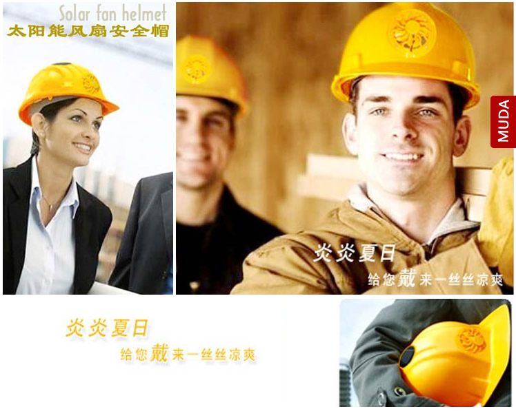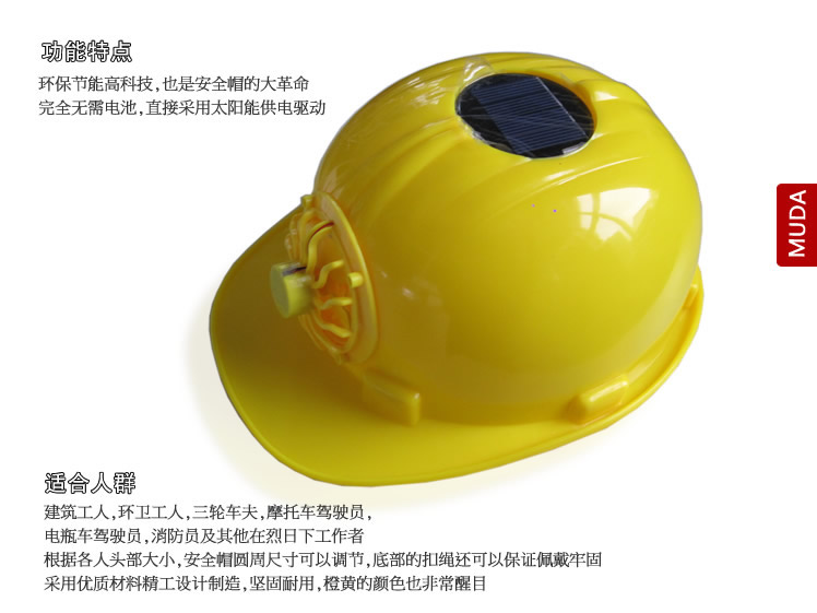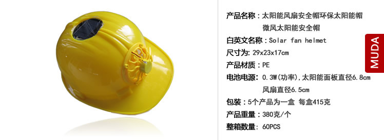商品名称:太阳能风扇安全帽环保太阳能帽 微风太阳能安全帽英文名称:Solar fan helmet功能特点:环保节能高科技,也是安全帽的大革命,完全无需电池,直接采用太阳能供电驱动!产品说明:新型的多功能安全帽,尤其适合夏天太阳底下作业的工作人员**型设计,在原有**安全帽上面巧妙安置太阳能电池面板和迷你小风扇。里面有中空隔温层,头盔不会紧贴头顶,形成很空爽的调节环境。 当有强烈的阳光直射,风扇**会启动,因为构造特殊,这时帽子里面**会形成一个风洞。可以明显感觉到凉风习习,头顶也不会和普通安全帽一样密不透风。根据各人头部大小,安全帽圆周尺寸可以调节,底部的扣绳还可以保证佩戴牢固。采用**材料精工设计制造,坚固耐用,橙黄的颜色也非常醒目。适合人群:建筑工人,环卫工人**车夫**驾驶员,电瓶车驾驶员,消防员及其他在烈日下工作者。工作环境:一般在强烈的太阳光照射下,风扇**会自动启动,如果光照不够强烈或者在室内均不会启动。可以在家用浴霸下检测风扇运转效果及状况。规格尺寸:29x23x17cm产品材质:PE电池电源:0.3W(功率),太阳能面板直径6.8cm,风扇直径6.5cm;单品重量:380g整箱数量:60PCS