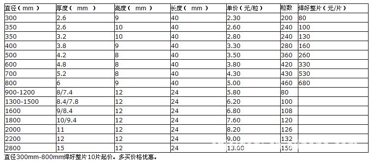 本厂生产的产品适用各类花岗岩矿石的切割,刀头的性能根据各地方的矿石可量身定做,使金刚石工具的使用效率达到**高标准,大切机用户自己焊接,小切机用户我们可以代理焊接锯片,款到发货,如刀头不适应可把刀头返发回厂后全额退款!价格根据用户提供刀头性能来定。