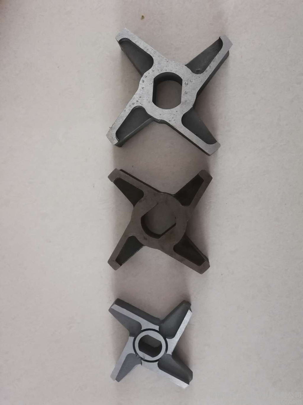 JR-130系三层篦子,二层刀。一共是4个篦子,2把四齿刀,一个预切板,可调3.5.7.13.的篦孔。刀具,篦子,预切板,螺杆都是天津的直接成品,度高,组合性好,所以生产能力高。使绞肉机阻塞的可能性为零。