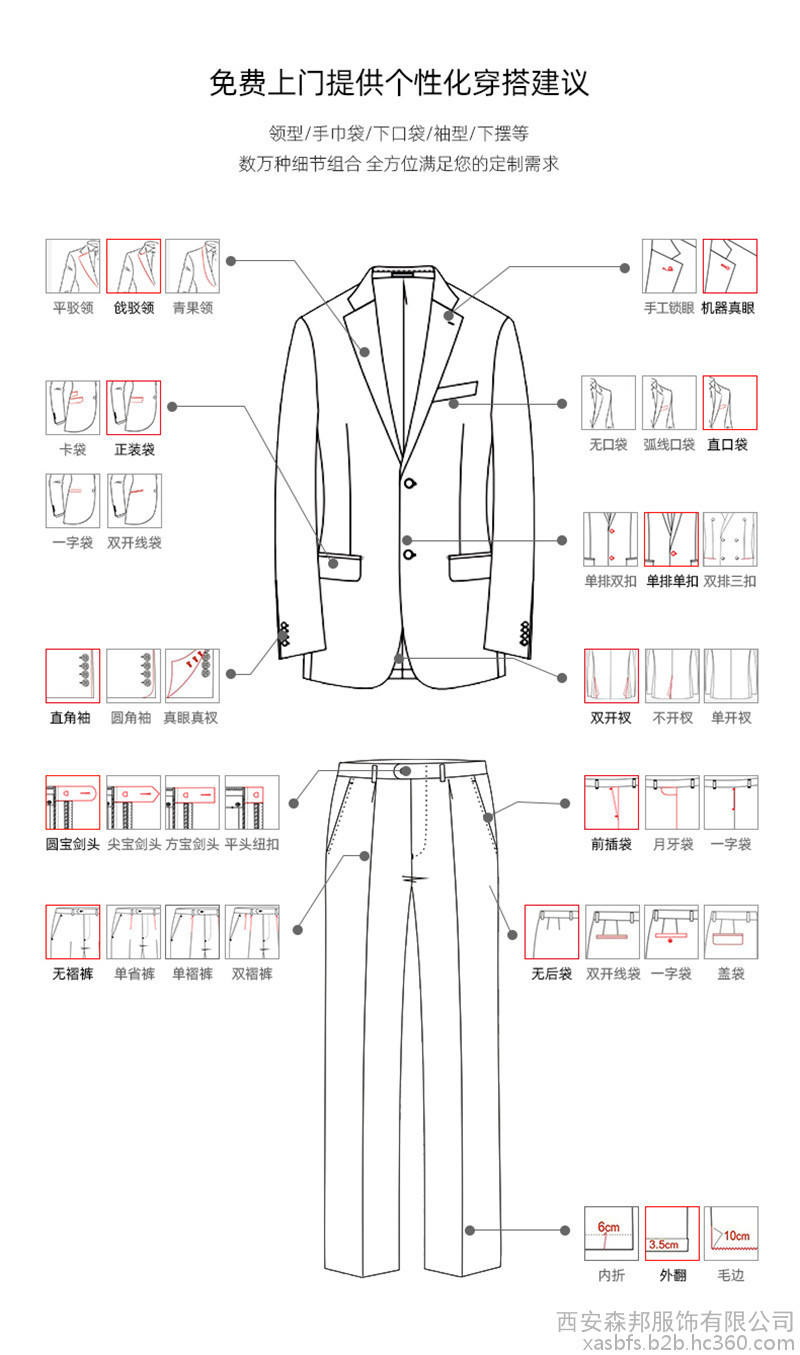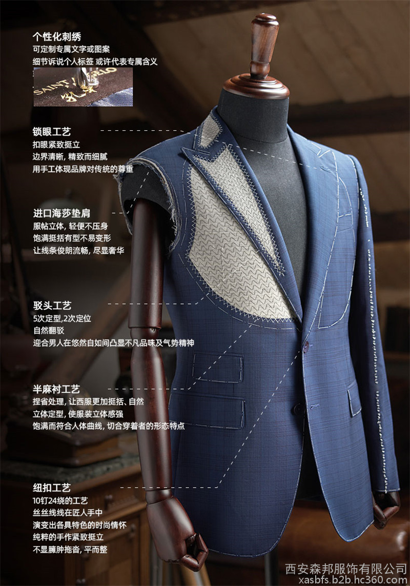 西安森邦服饰有限公司是一家集设计、生产、销售为一体的专业化职业装销售、生产企业。 旗下服装定制品牌【森 睿 邦】为您量身定制: 【SENRUIBANG】传承经典,时尚 定制纯手工西服、西服定制、团体制服及职业装、定制休闲西服、男士礼服;定制衬衣、正装西裤、夹克、马甲、大衣及羊绒大衣。 森邦服饰公司旗下服装厂【铭楊制衣】拥有专业设计师多名,20多年从业经验的裁剪师十多名、技术力量雄厚,先进的生产设备上百台,生产员工200余名。主要从事高品质的西装、时尚职业装、企事业单位的工作服、职业装、保安服、工程服、酒店制服、银行及特种行业等服装的设计和制作,同时承接各种工程窗帘及自主品牌【森 睿 邦】家纺的设计和制作。 西安森邦服饰有限公司一直秉承以用户需求为核心,为客户提供产品及便捷的服务。用心的服务期望能赢得客户的信赖和好评,我们坚信在我们团队的不懈努力下,将逐渐树立起西安森邦服饰良好的品牌及形象。 我们以“专注服装,用心服务”为核心价值,通过我们专业的水平和不懈的努力,以服饰文化的品味来维护并营造企业的形象、塑造企业的文化。我们坚信,经过不断努力和追求,一定能够实现与各企业的互利共赢,打造属于国内的时尚职业装品牌。
