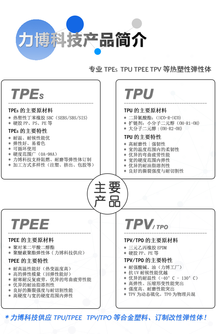 力博全程提供详细TPE、TPR、TPO、TPEE、TPU、PA12弹性材料产品资料。