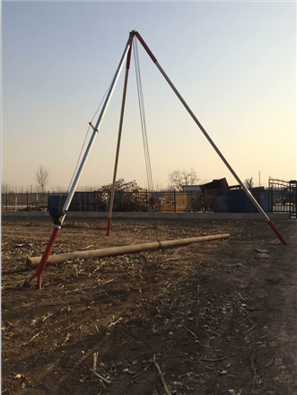 使用方法:1、用立杆机主杆上配带的销钉,把主杆(长杆)、两副杆的头部进行连接。2、把三杆成三角形状平放在地面上。提示:三杆头部连接处应位于杆坑处。3、三名施工人员,各自握住一根杆体,用力上推把该机立起。提示:在上推时为了不使杆体左右偏移,应保持三根杆的跟部不离开地面,三杆上推时推升距离应相等。例:主杆上推1米两副杆也应同步上推1米。4、三角架立起后应保证三杆头部连接处与线杆坑底部垂直。5、把将要立起的线杆运至适当位置,详细见下图表。如果您为线路施工组立线杆费时费力而苦恼,请选用我厂生产的立杆机,本厂生产的铝合金铝合金立杆器采用国标铝合金型材制作而成,立杆机具有重量轻,负荷大,操作简便的有点,是您电力施工中的好帮手。欢迎来厂参考考查,热线电话24小时为你接通!