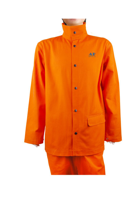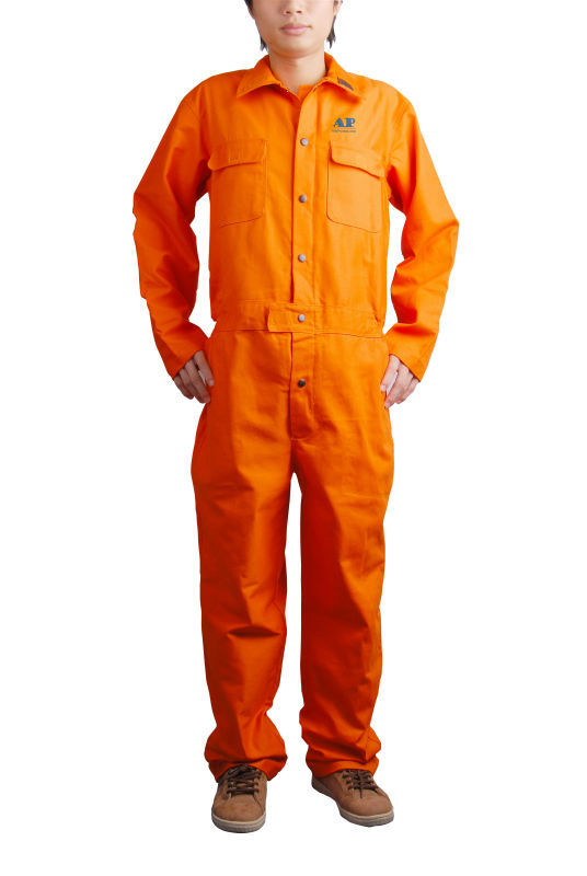 由11安厚度可水洗防火阻燃布制成,时尚的连体款式造型,塑造新时代工人自信形象,可翻亦可直立式衣领更有效保护颈部位置。两幅加折式橡筋,造型新款适合不同腰围的人穿,前幅纽扣组合方便穿卸,袖口配可调纽扣。