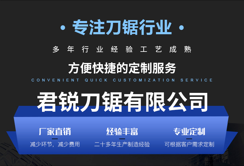 君锐刀锯有限公司坚持以高产品质量、合理的产品价格和售后服务投放市场,从而得到国内外知名品牌企业