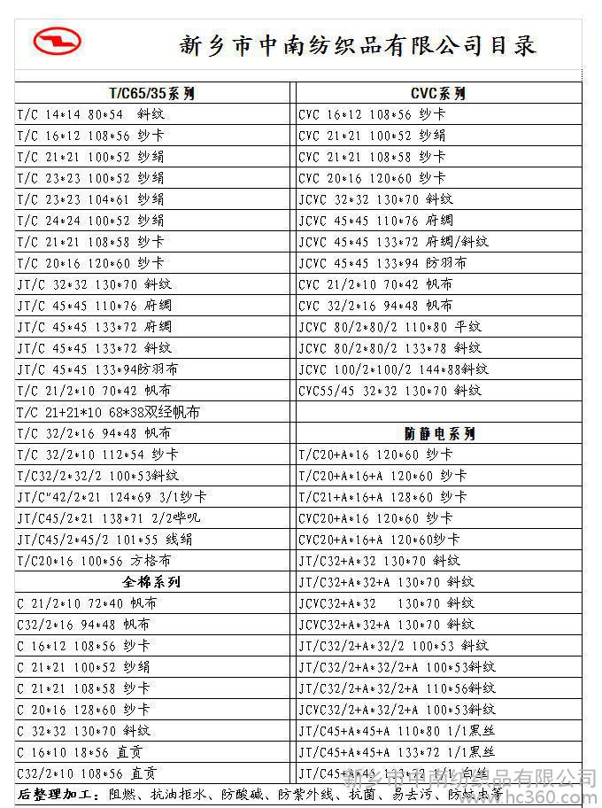 新乡市中南纺织品有限公司防紫外线面料常规品种有: