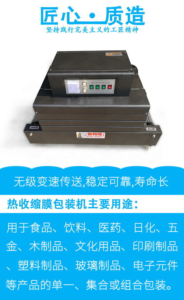 收缩包装是目前国际市场上较先进的包装方法之一。它是采用收缩薄膜包在产品或包装件外面,然后加热,使包装材料收缩而裹紧产品或装件,充分显示物品的展销性,以增加美观及价值感;同时,经热收缩机包装后的物品能密封、防潮、防污染,并保护物品免受外部的冲击,具有一定的缓冲性,此外,可减低产品被拆、被窃的可能性;收缩膜收缩时产生一定的拉力,故可把一组要包装的物品裹紧,起到绳带的捆扎作用,特别适用于多组物品的集合与托盘包装,故本产品可广泛用于各种小产品的包装。广泛应用于食品、饮料、医药、日化、五金、木制品、文化用品、印刷制品、塑料制品、玻璃制品、电子元件等产品的单一、集合或组合包装。