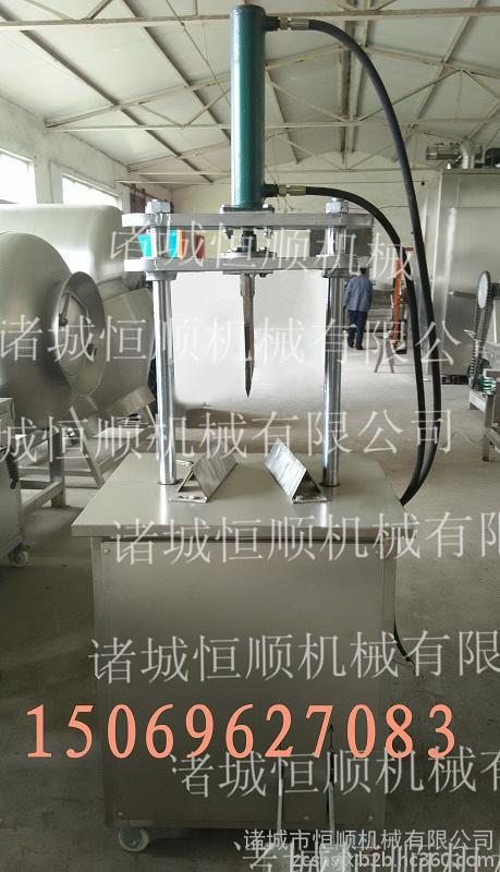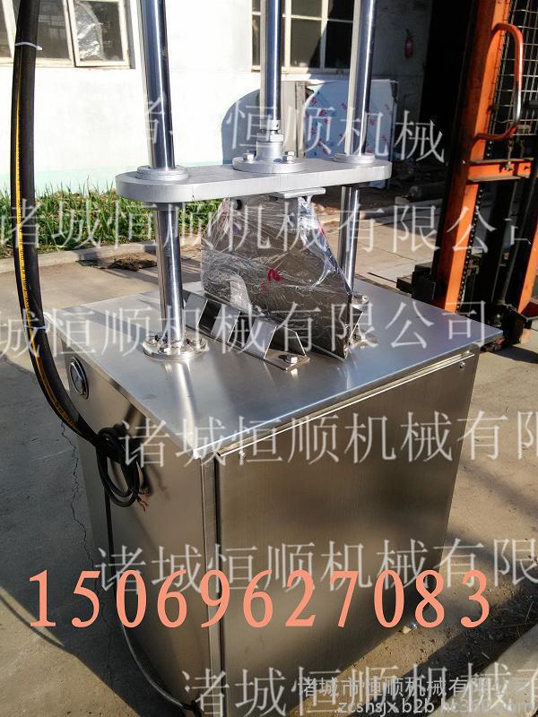 猪头劈半机采用液压工作原理而设计的一种专门加工动物头部劈开的一种专用设备。利用油缸带动刀架上下移动来实现,将猪头劈开,刀架滑动采用轴套式设计。活动空间小,工作稳定,油缸使用寿命**板架用20cm原钢板制作,紧固不变形,上下移动轴用40cy材料。耐磨、耐用、易保养,电机2.2kw,每小时产量可达150头以上。