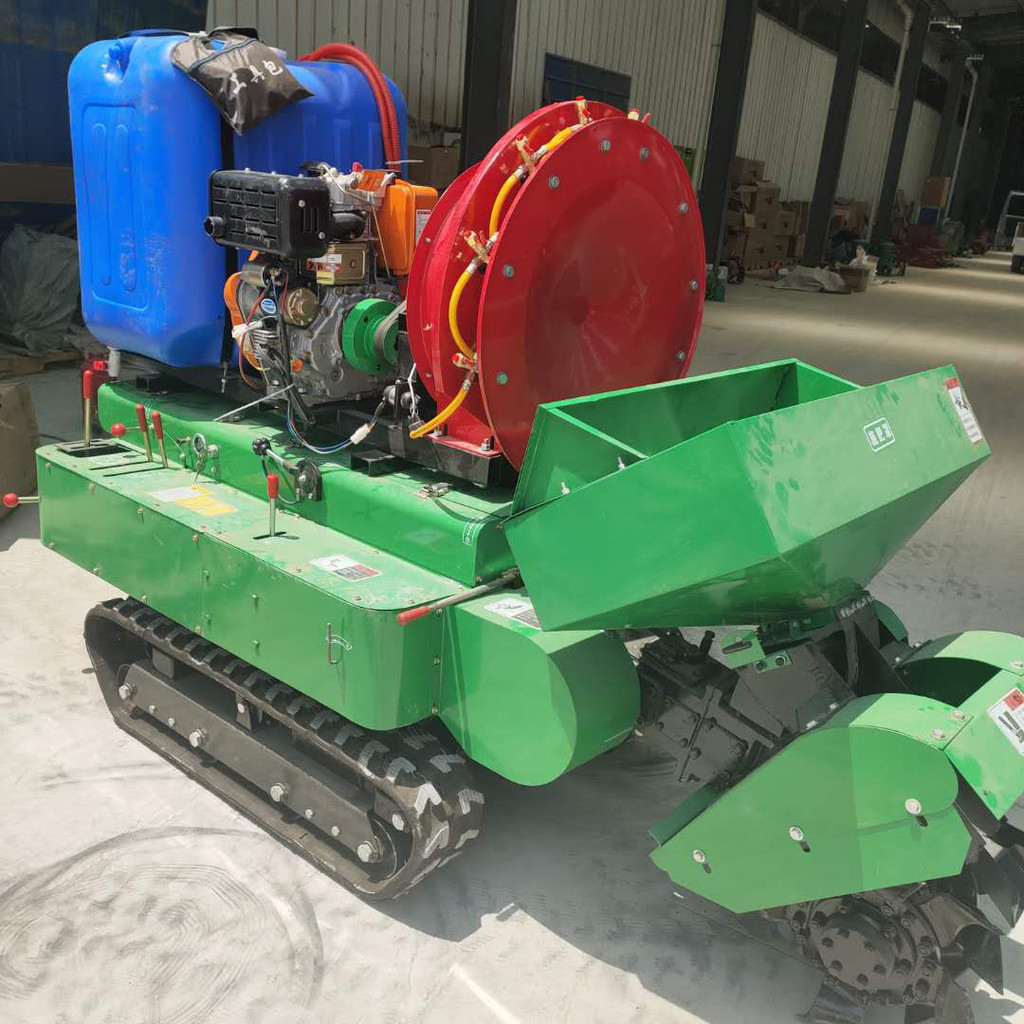 本产品采用履带式驱动设计,稳定性和爬坡能力较强,适应丘陵山地平原各种地形,机型小功率大,适应各种行距的果树,大棚,园林,主要有以下六种功能,(1)开沟施肥回填埋肥一次完成(2)单独开沟(3)单独回填(4)旋耕功能(5)除草功能(6)风送打药,用户选配