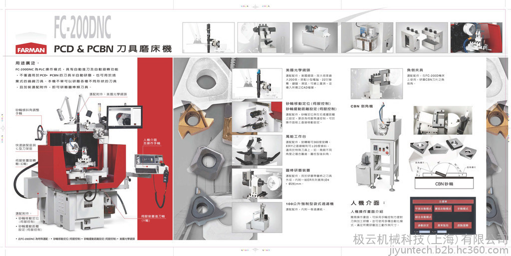 远山FC-200DNC为PLC操作模式,具有自动进刀及自动回转功能,不仅适用于PCD.PCBN的刀具半自动研磨,也可以用于舍弃式的钨钢类的刀具.本机不单可以研磨各种不同形状的刀具,且加装选配附件,即可研磨圆棒类刀具.