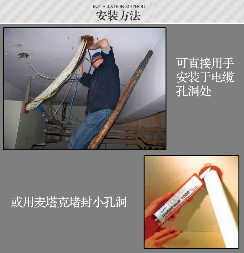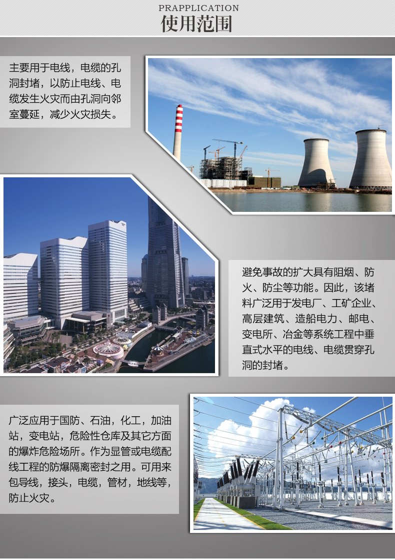 适用于工矿企业、高层建筑、造船、冶金、发电、邮电中电线、电缆等贯穿物穿过隔墙时的孔洞封堵,也防止发生火灾时火焰由孔洞向邻室蔓延。