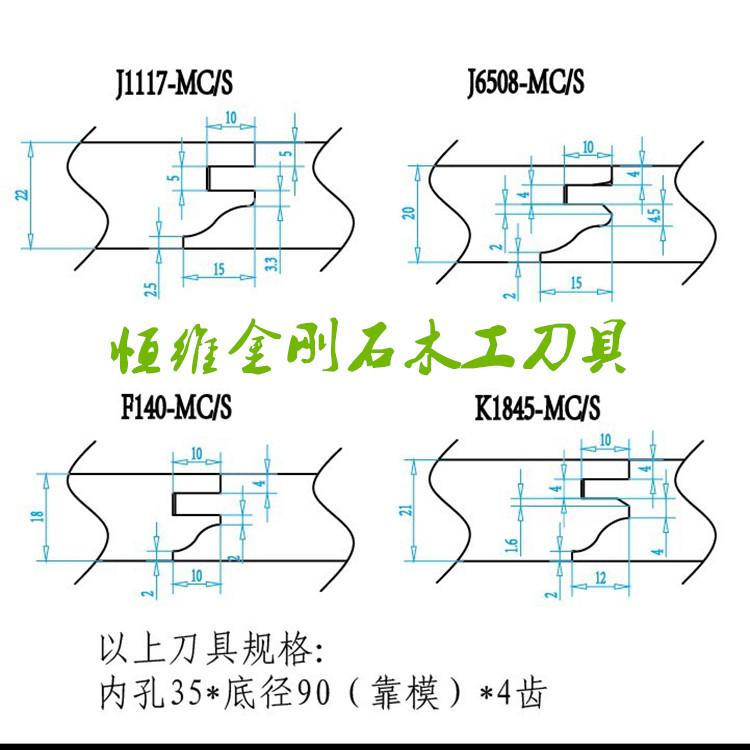 名称:橱柜门框刀、小柜门刀、衣柜 一、工艺要求: 1.刀具内孔:∮25.4、 ∮30、∮35, ∮40 ∮50 2.刀具的转向(顺时针或逆时针) 3.外径:常规80mm- 350mm 4.齿数:短凖常规4齿,长凖常规6齿 5.靠模(底径):常规70-120 6.槽宽:常规6mm、8mm、10mm、12mm