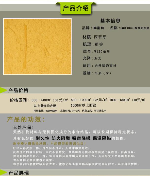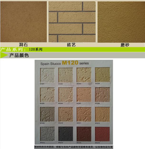 西班牙灰泥室内专用壁材,它分为120系列(骨材粗一些)、140系列(骨材小一些),170系列(喷涂系列)。西班牙灰泥由自然界矿物质和天然粘接剂构成,不含任何有害物质及有害添加剂,只需加水搅拌成泥,使用专用工具手工制作所需产品,是室内外装饰装修绿色环保材料。