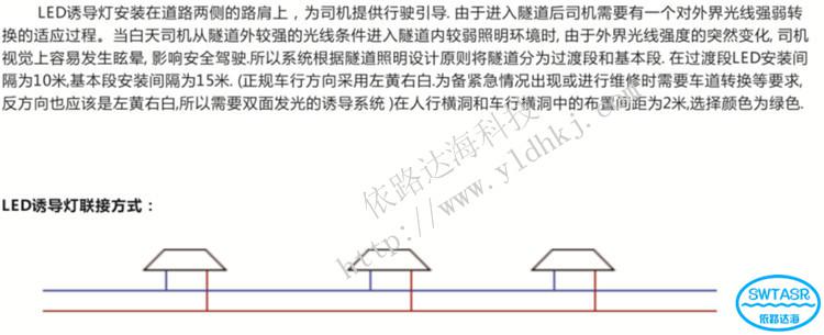 LED诱导灯又称光电突起路标,是我公司专门研发生产的主要作用是为行驶在公路、隧道、引道路肩、环岛、安全岛的路沿侧壁上车辆主动式安全行驶诱导的LED产品。安装在隧道或其他道路路面两侧的LED诱导系统可有效地改善路面的视觉光度效果,提高司机对路面特别是隧道路面的辨别能力,从而保障车辆行驶安全。LED诱导灯由于是一种清晰、醒目可调的主动闪烁发光的视线诱导标志,连续布设形成发光车道轮廓线,既起到优良明显的导向警示作用,又能为之增添靓丽的风景线。 隧道内安装LED诱导系统后,隧道路面的视觉效果也得到了显著提高。