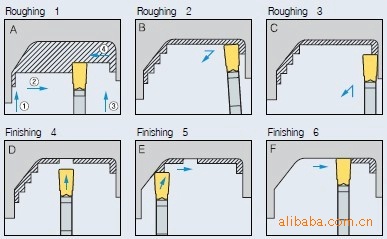 1.在**初直径处切槽 2.端面车削有内向外 3.向中心方向进行车削加工