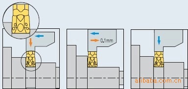 MGT刀具作为一种多功能刀具,可进行切槽与车削加工。当使用MGT刀具时,须谨记此刀具模仿ISO标准车削加工应用,此加工使用正后角,在此刀具的切削力与切深都实施在风一加工中。这将导致刀片一定程度的磨损,车削后,切槽加工工序将无法达到**终要求直径。为清除直径偏差,刀具向后移动0.01mm,然后回至切槽加工的原始位置。