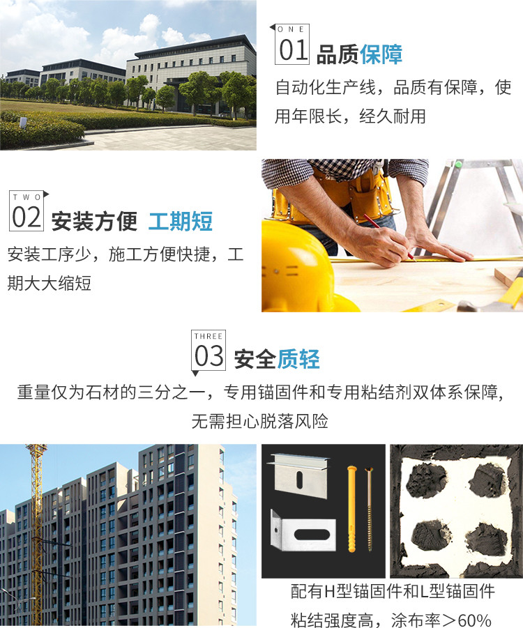 重量仅为石材的三分之一,专用锚固件和专用粘结剂双体系保障无需担心脱落风险。